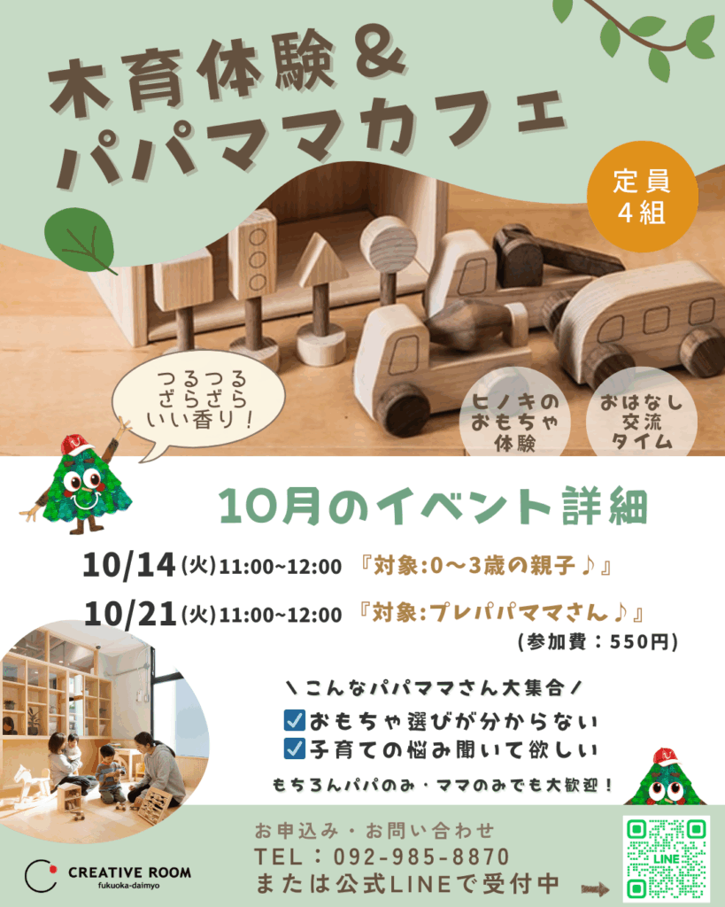 【10/14(火)・10/21(火)】親子イベント「木育体験&パパママカフェ」を開催します〜親子でほっとできる、やさしい時間を🌿〜