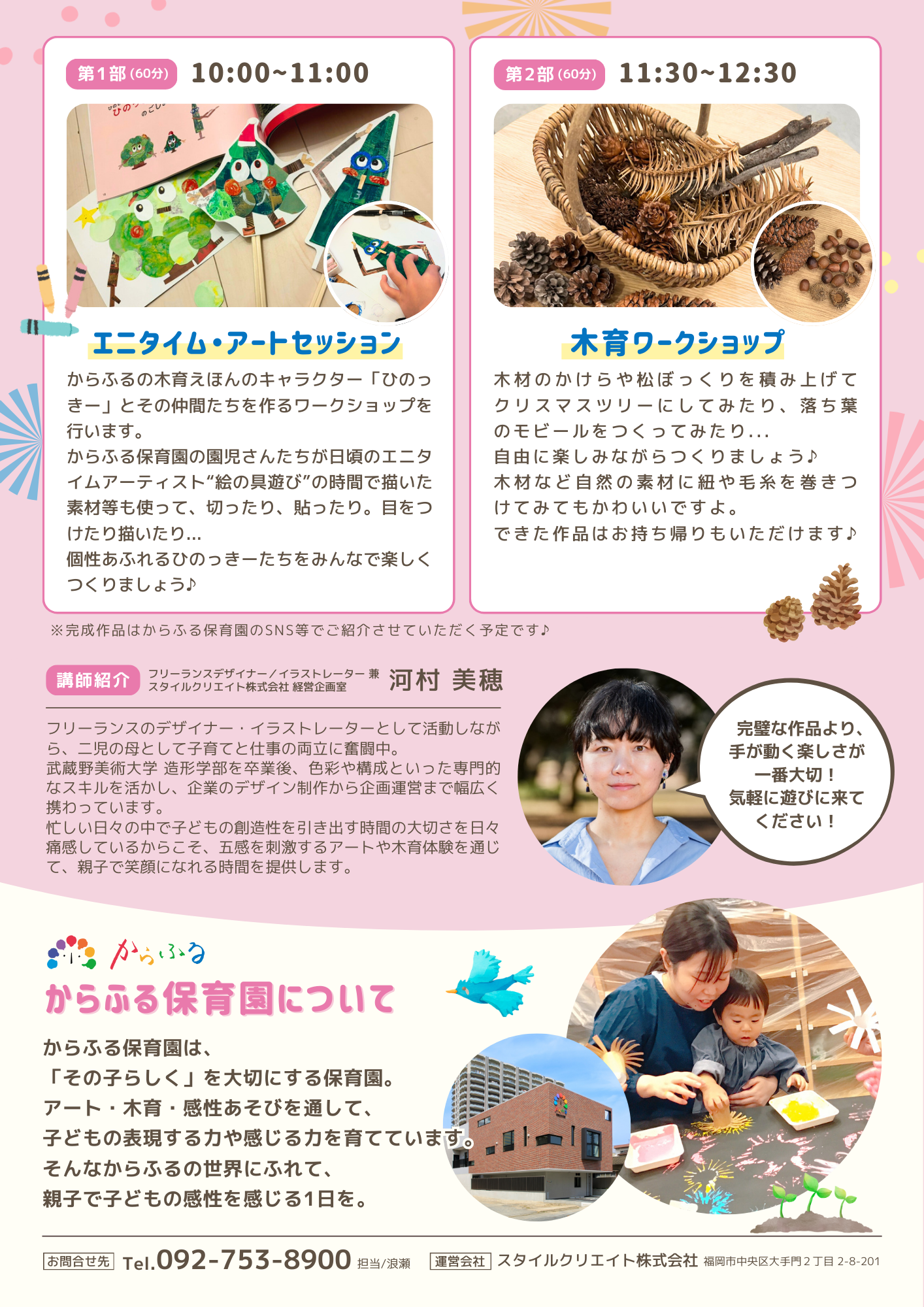 | 会 場 | からふる福岡東保育園(福岡市東区水谷2丁目10−26) ※駐車場あり(8台)/ベビーカーでの来場OK |