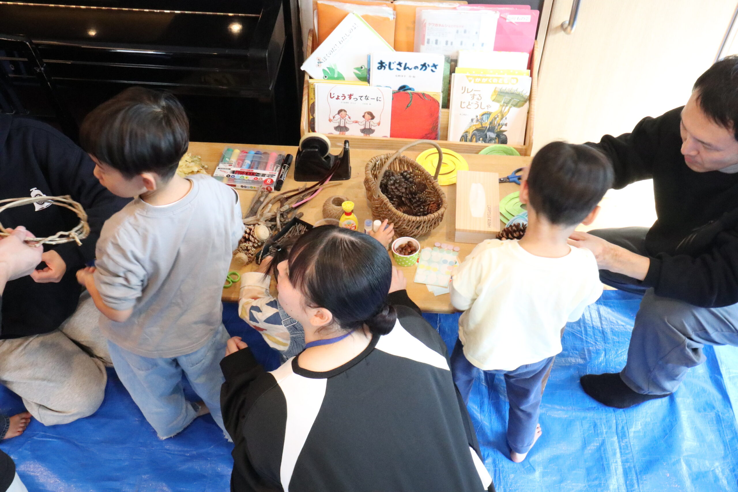 普段、なかなか自然物に触れる機会が少ない中で、保護者の方も「懐かしい」「楽しい」と感じながら、一緒に制作を楽しまれていました。