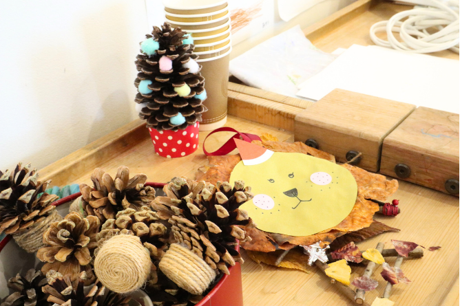 ミニツリーを作る子、リースを別のものに見立てる子など、同じ素材でも作品はぜんぶ違うのがとても印象的でした。