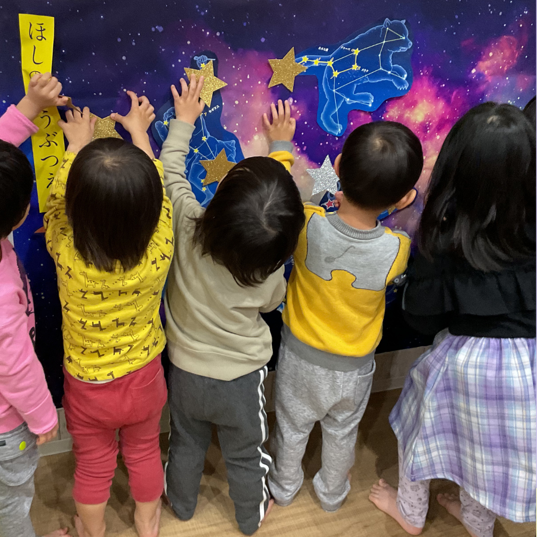 季節ごとの星座や七夕の物語などに親しみながら、保育室に出現した星空を見上げたり、星座のお話を聞きながら、自然と宇宙への興味を深めていきます。
