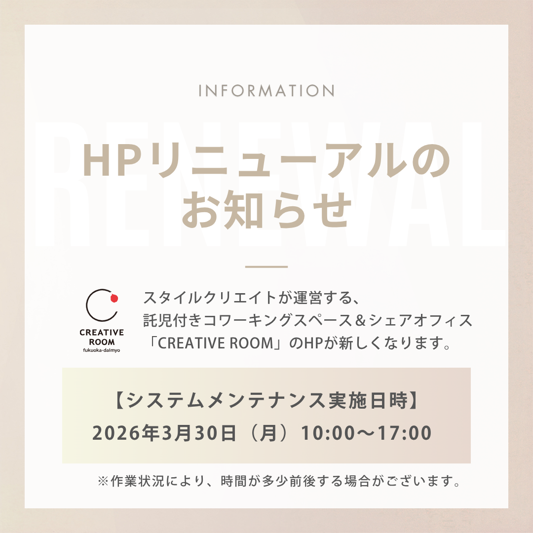 スタイルクリエイトが運営する、託児付きコワーキングスペース&シェアオフィス CREATIVE ROOMのホームページが新しくなります!《3月30日(月)リニューアル》